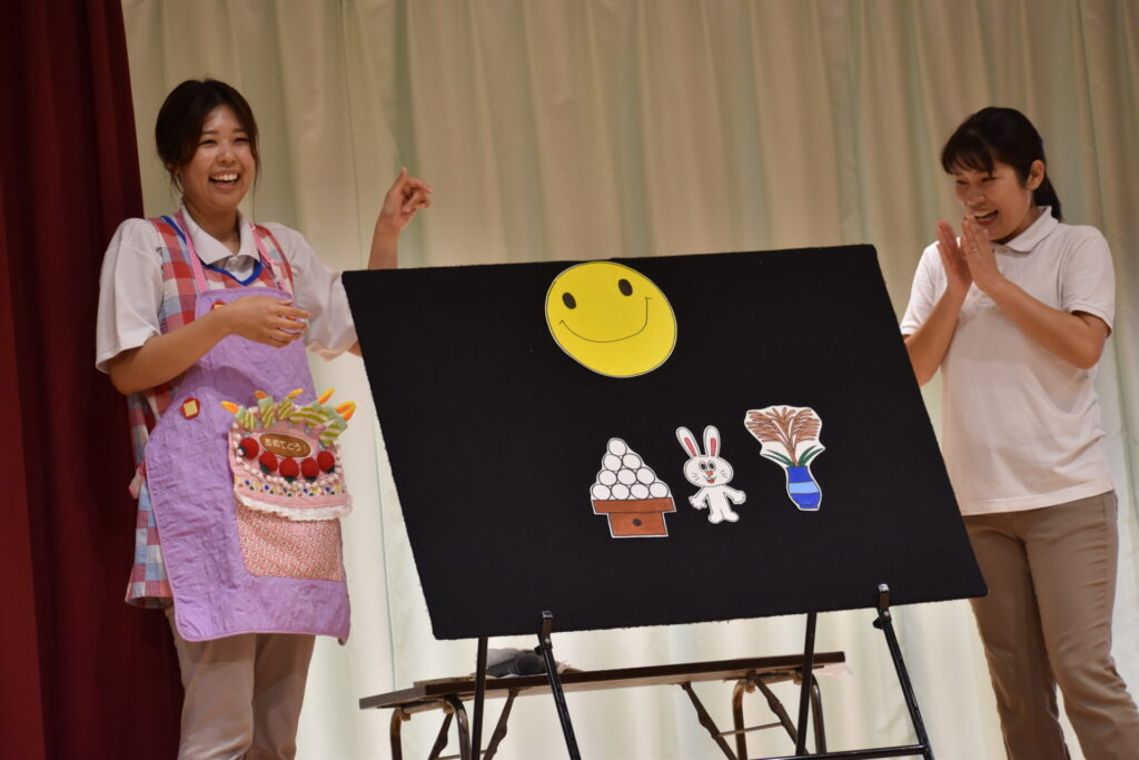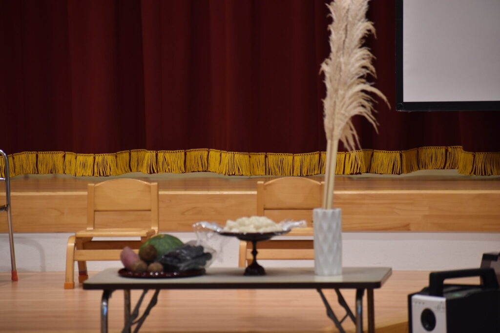 ススキや団子と秋野菜をお供えしてみんなで楽しくお祝いしました。