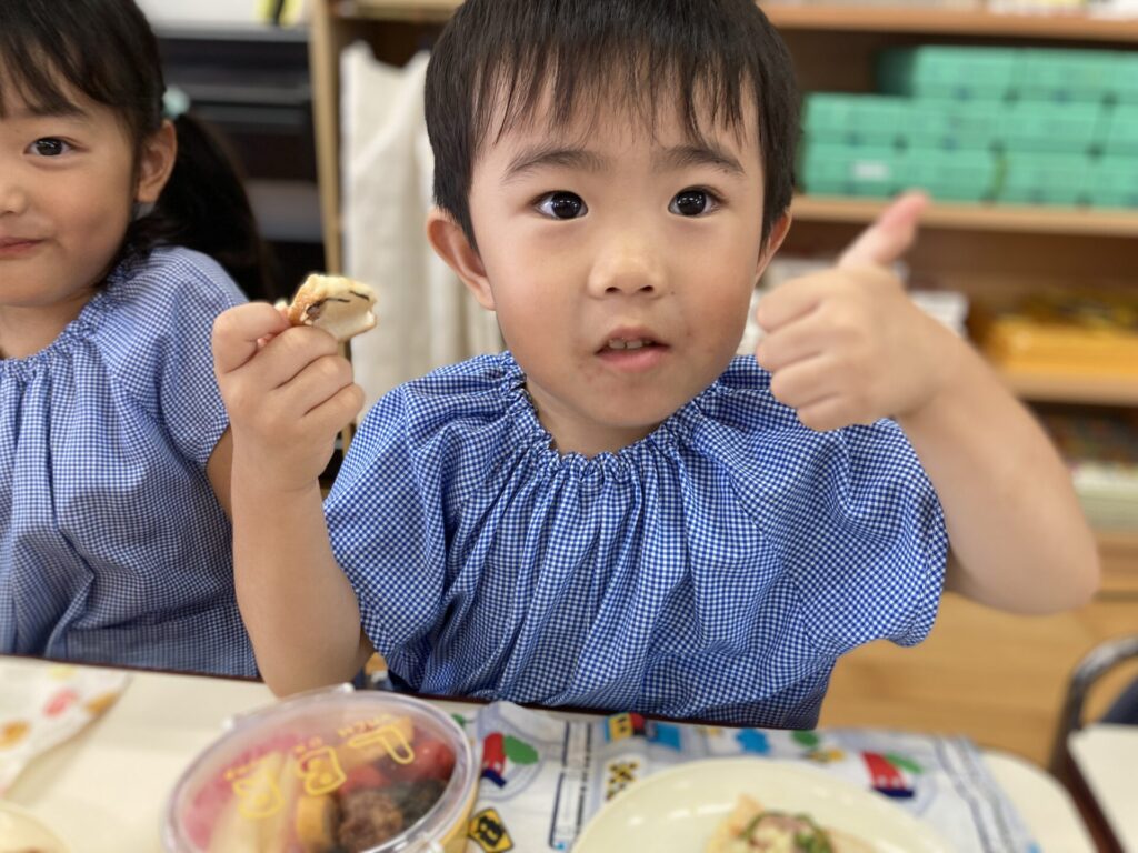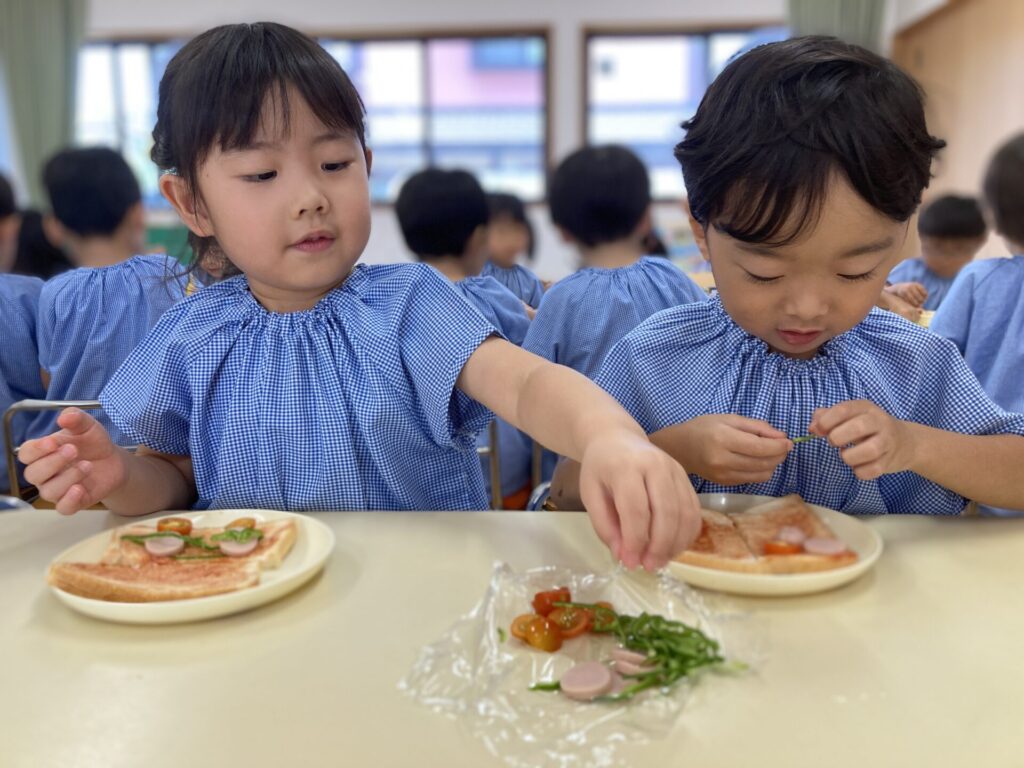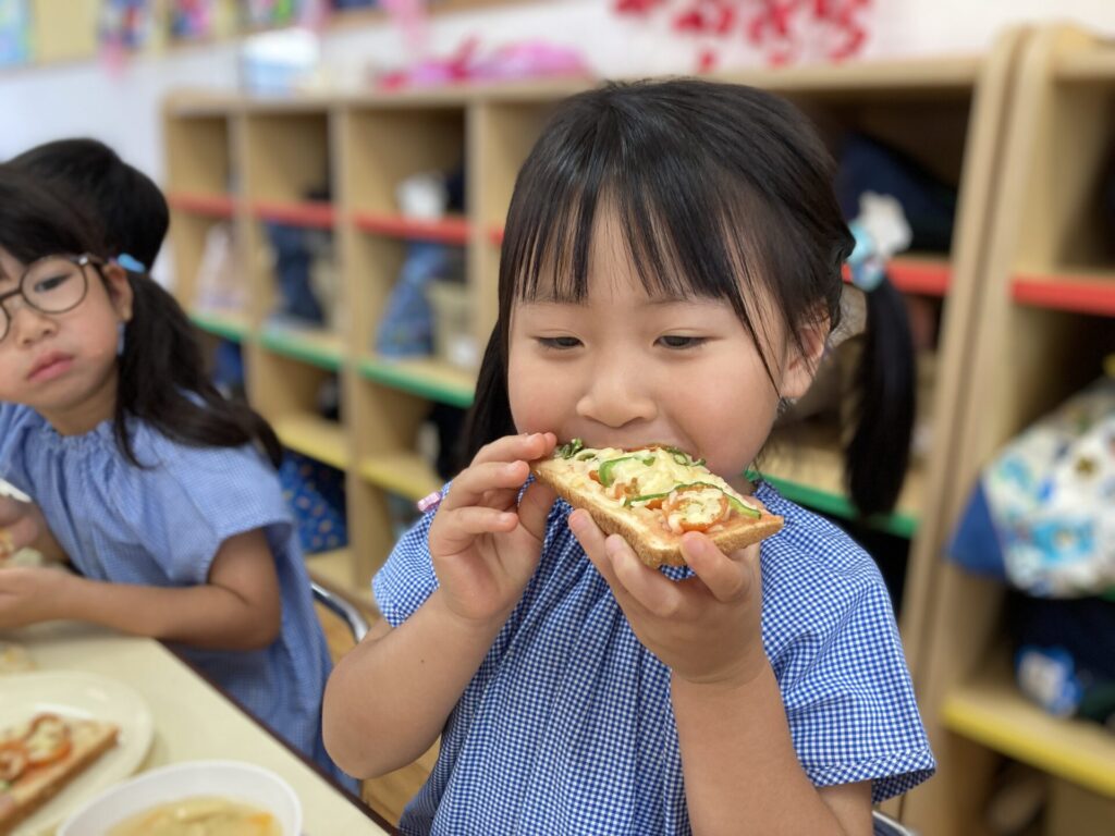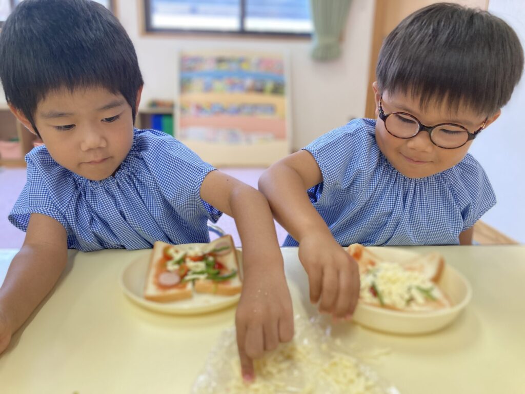 毎年恒例の年中さんのピザトーストづくりを行いましたよ。