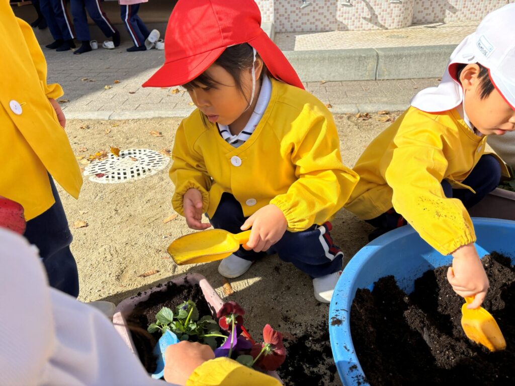 パンジーやチュウリップの苗植えをしたり