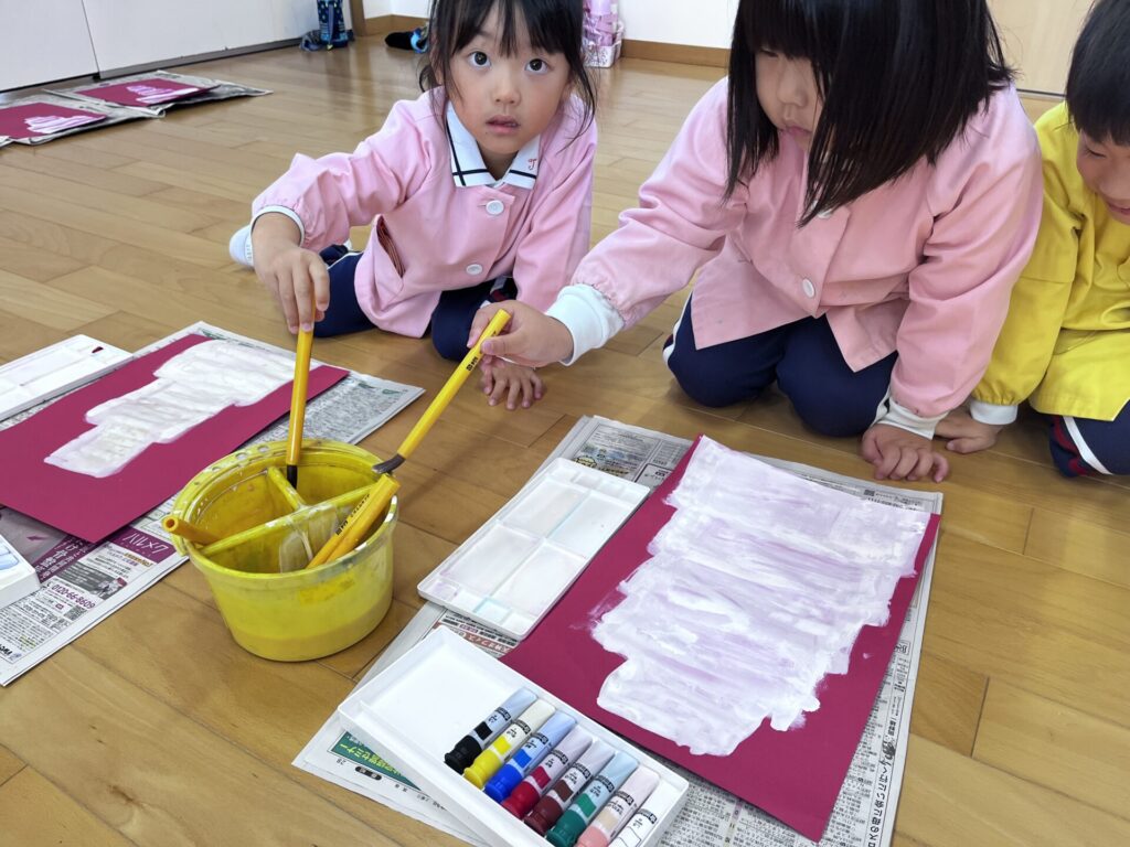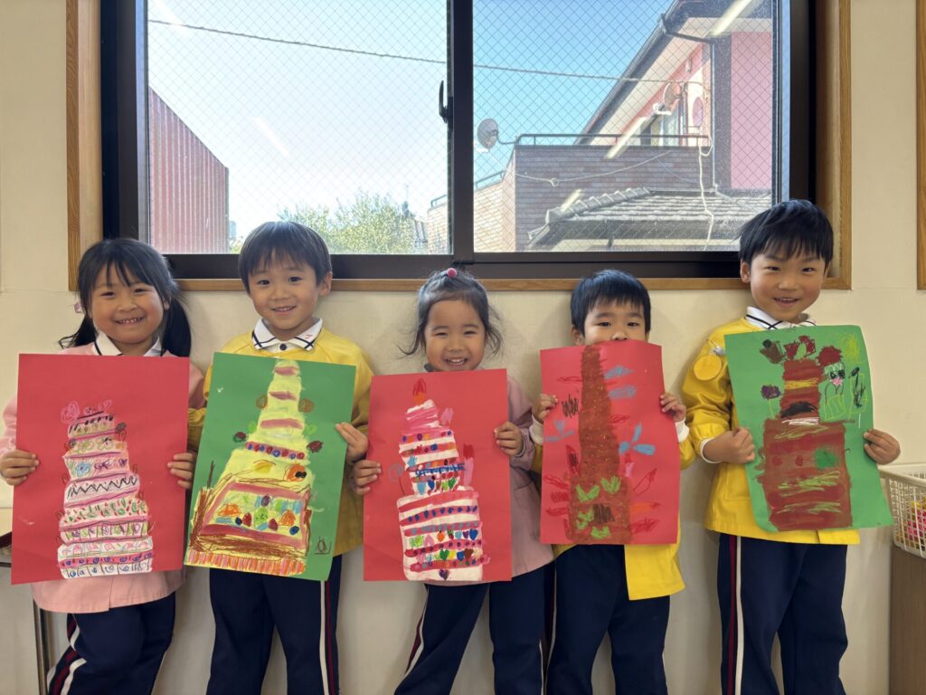 オリジナルのクリスマスケーキの製作では、いつもよりながーい色画用紙に描いていきます。