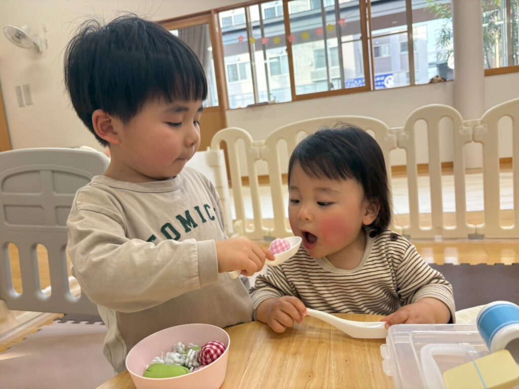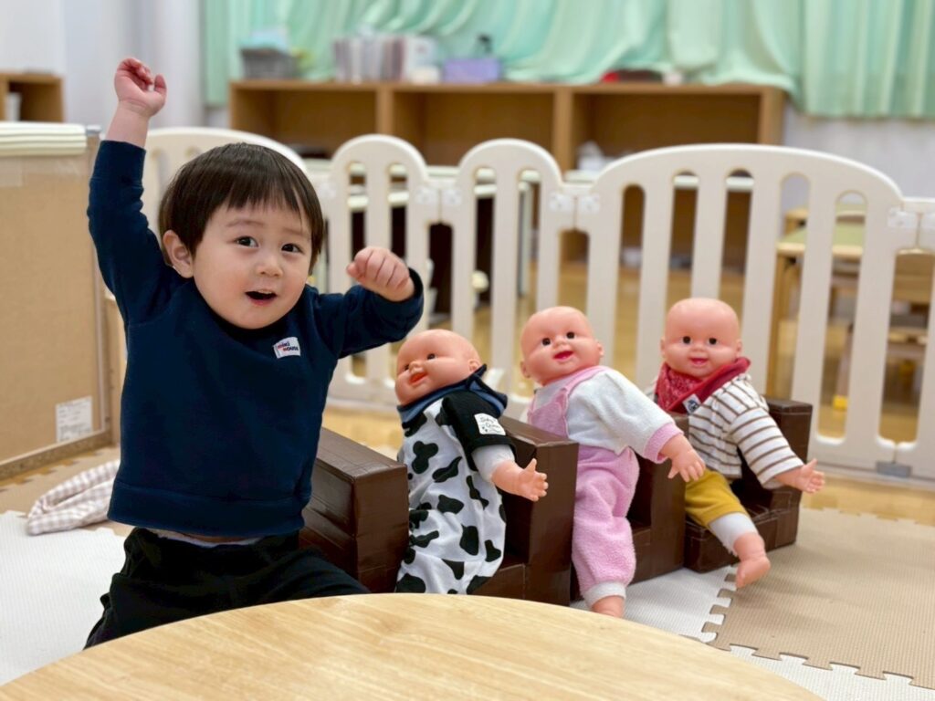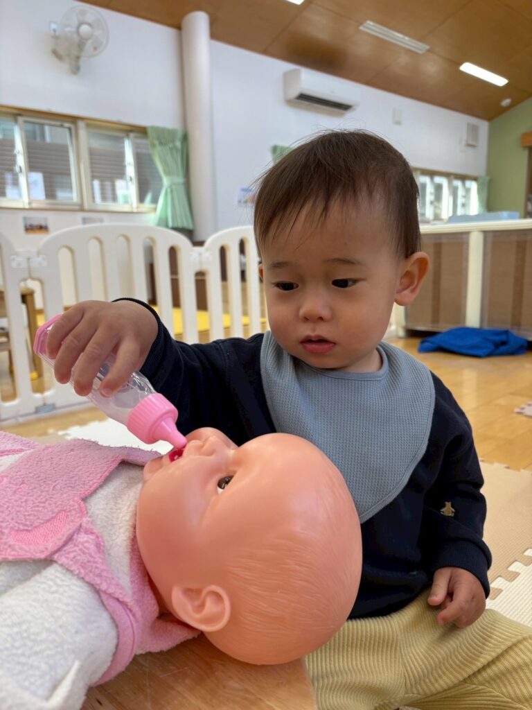 赤ちゃんのお人形のお世話をしたり、電車ごっこをしたり